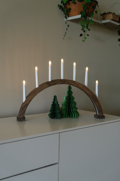 Denna klassiska elljusstake med sju ljus skapar en varm och hemtrevlig adventsstämning. Bågen är tillverkad i trä med brunbetsad finish som ger ett naturligt och tidlöst uttryck. De vita ljusen ger ett mjukt och behagligt sken som passar perfekt i fönstret under mörka vinterkvällar. En traditionell adventsbelysning som sprider julkänsla i hela hemmet. Levereras med 1,7m sladd, strömbrytare och stickkontakt. Ingår 7st utbytbara E10 glödlampor.