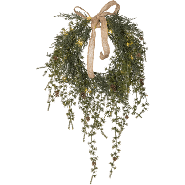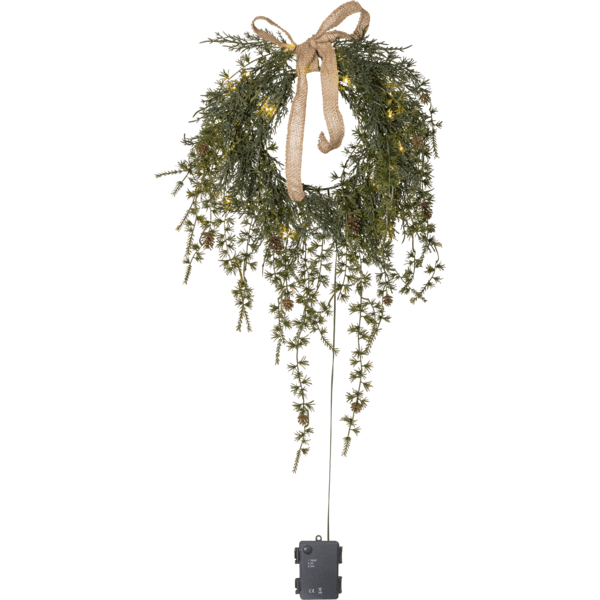 Krans Barr har grenar som är långa och svepande, gjorda i PE material, vilket är ett bra miljöval. Med 20st varmvita ljuspunkter går den att använda både som en dörrkrans utomhus eller som en väggkrans inomhus. Som en extra dekoration har denna krans även en rosett i jute material. Kransens slinga drivs av 3st AA batterier och har även timerfunktion (6h på, 18h av, repeterande) och när brytaren är på timerläget lyser kransen i ca 30 dagar. Batterier ingår ej. Levereras med 50cm sladd till batteriboxen.