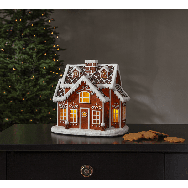 Fantastisk juldekoration, i form av ett pepparkakshus. När produkten är påslagen lyser det fint i fönstren med varmvitt sken. Både sladd med transformator och batterifunktion med timer (6h på, 18h av, repeterande). En stämmningsful juldekoration som ger det lilla extra. Dekorera barnens rum eller varför itne placera den på en skänk så att alla i familjen kan se den. Vid användning av batterifunktionen drivs den av 3st AA batterier, ingår ej.