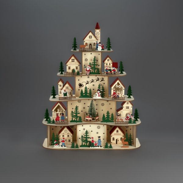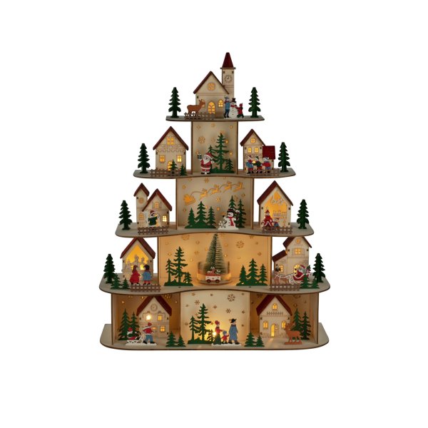Skapa en varm och stämningsfull julkänsla med denna dekorativa julby i trä. Den detaljrika designen i flera våningar visar små hus, granar och vintermotiv som tillsammans bildar en charmig julsaga. De integrerade LED-lamporna lyser upp scenerna och ger ett mjukt, inbjudande sken. En perfekt dekoration för bord, fönster eller sideboard under hela advent och jul. Julbyn drivs med 3st AA batterier (ingår ej) och är utrustad med timerfunktion, 6h på och 18h av, repeterande, vilket gör den både praktisk och energisnål. Medföljer även USB kabel för den som vill använda sladd (transformator ingår ej).