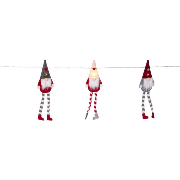 Batteridriven ljusslinga med 8 st lite större tomtedekorationer gjorda av trä och tyg i juliga färger. Varmvita LED dioder ger ett fint ljussken. Fin dekoration till tex julgranen eller bordsdukning. Utrustad med timer, 6 h på, 18 h av, repeterande. Levereras med 30cm extra kabel från batteriboxen till första tomten. Drivs av 2st AA batterier (ingår ej). Brinntid ca: 80h.