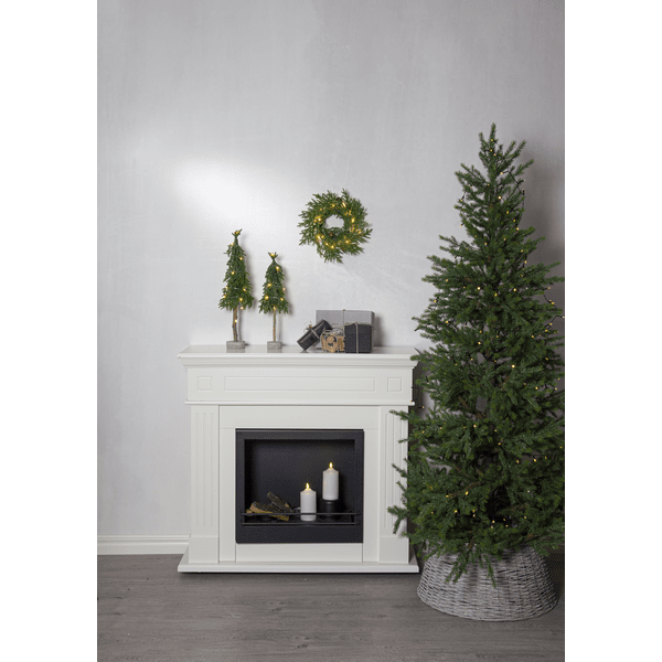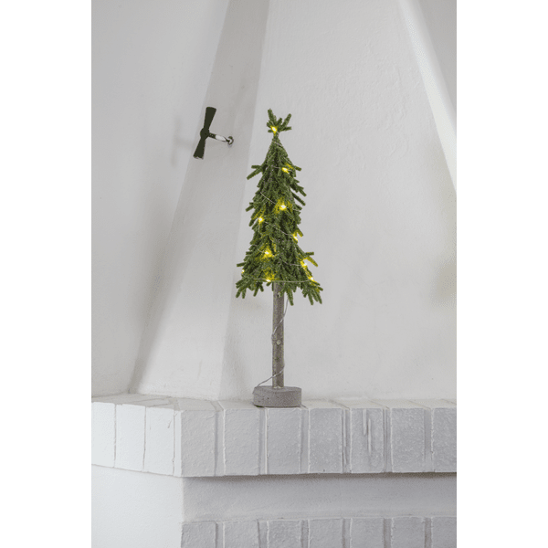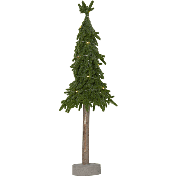 Dekorativ, mindre bordsgran i PE material med lite glitter och stabil fot av cement. Trädet lyser upp med sina 15st små varmvita LED-dioder. Placera förslagvis på sidobordet, under granen eller på matbordet som dekoration vid dukning. Levereras med 30cm sladd till batteriboxen. Trädet drivs av 2st AA batterier, ingår ej. Brinntid ca: 200h.