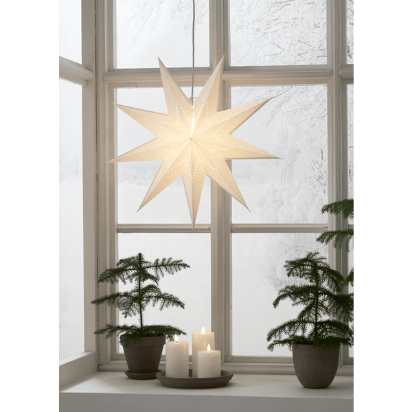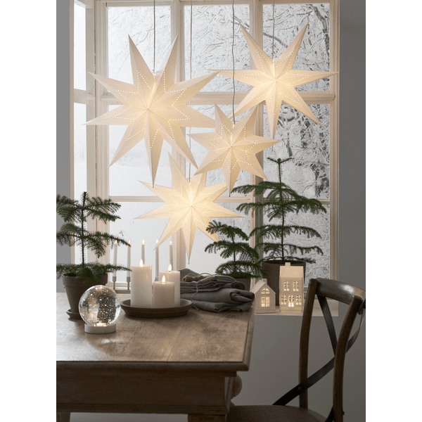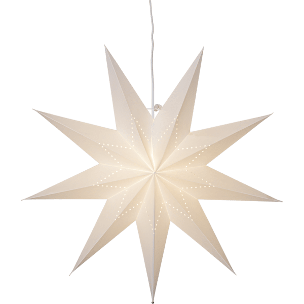 Vit pappersstjärna med hålmönster i form av en stjärna. Dekorera med till jul och advent. Häng en eller flera stjärnor tillsammans i ett fönster eller mot en vägg. Levereras med 3,5m vit sladd och stickkontakt. Ljuskälla ingår ej.