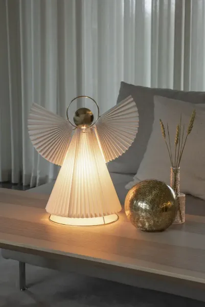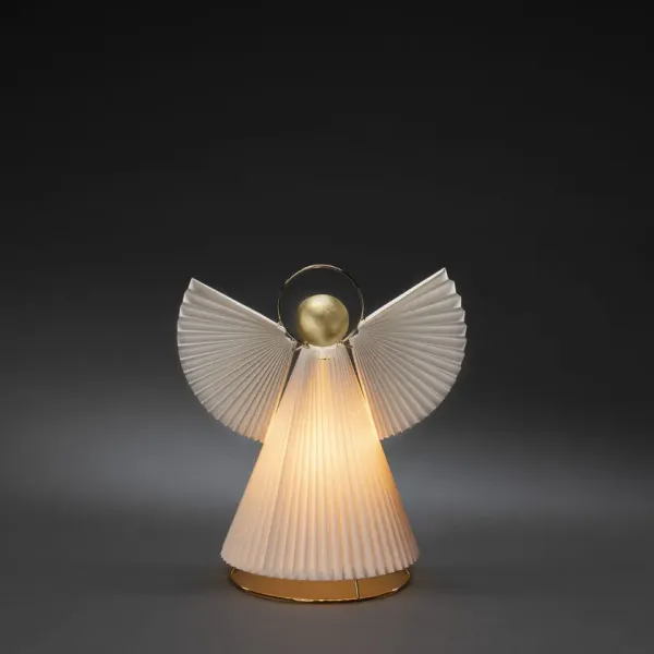Stilren pappersängel med veckade detaljer och gyllene huvud – en vacker dekoration som passar perfekt i fönster eller på bordet. Skapar en lugn och varm stämning i hemmet under advent och jul. Enkel att placera och en elegant kontrast till traditionell juldekor. En tidlös favorit år efter år. Levereras med 5m vit sladd, strömbrytare och stickkontakt. Ljuskälla ingår ej.