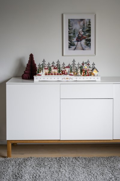 En vacker tomteby med många dekorativa detaljer, gjord av trä. Den inbyggda LED belysningen lyser vackert i varmvit färg och skapar en mysig atmosfär i hemmet. Placera förslagsvis på en byrå i hallen eller i fönstret i vardagsrummet. Tomtebyn är utrustad med timer på 6h som drivs av 2st AA batterier (ingår ej). Går även att använda produkten utan timer med den medföljande USB kabeln.